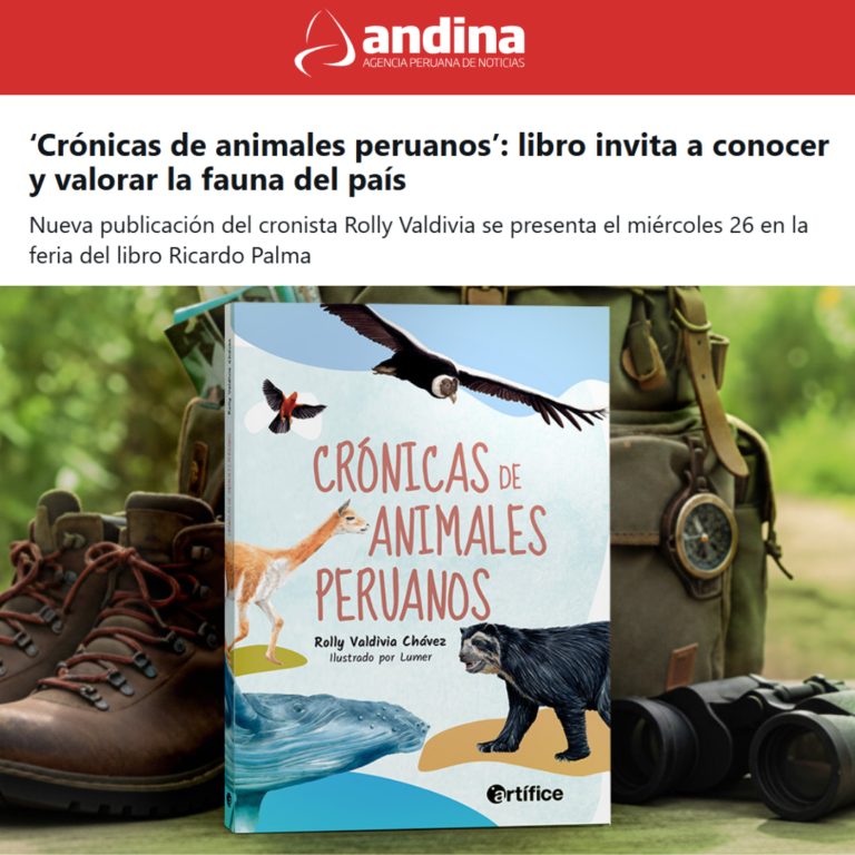 ANDINA: ‘CRÓNICAS DE ANIMALES PERUANOS’, UN LIBRO QUE INVITA A CONOCER Y VALORAR LA FAUNA DEL PAÍS En medios - noviembre 22, 2025noviembre 22, 20250 FICHA Medio: Andina Sección: “Cultural” Fecha: 19 de noviembre de 2025 Mención a Rolly Valdivia Chávez, autor del libro informativo “Crónicas de animales peruanos”, ilustrado por Lumer. Lee la nota completa aquí: «“Crónicas de animales peruanos”: un libro que invita a conocer y valorar la fauna del país». Foto: Freepik Compartir con:TweetWhatsAppCorreo electrónico