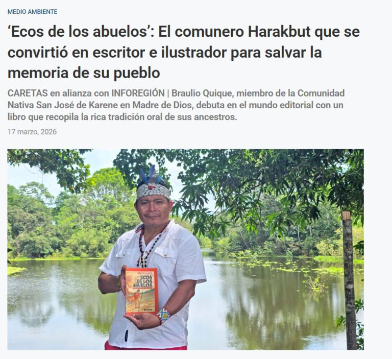 CARETAS | ‘ECOS DE LOS ABUELOS’: EL HARAKBUT QUE SE CONVIRTIÓ EN ESCRITOR PARA SALVAR LA MEMORIA DE SU PUEBLO En medios - marzo 29, 2026marzo 24, 20260 FICHA Medio: Caretas Sección: “Medio ambiente” Fecha: 17 de marzo de 2026 Con mención al escritor Braulio Quique, autor del libro “Ecos de los abuelos. Memorias del pueblo harakbut”. Lee la nota completa aquí: «“Ecos de los abuelos”: El comunero harakbut que se convirtió en escritor e ilustrador para salvar la memoria de su pueblo». Foto: Editorial Artífice Compartir con:TweetWhatsAppCorreo electrónico