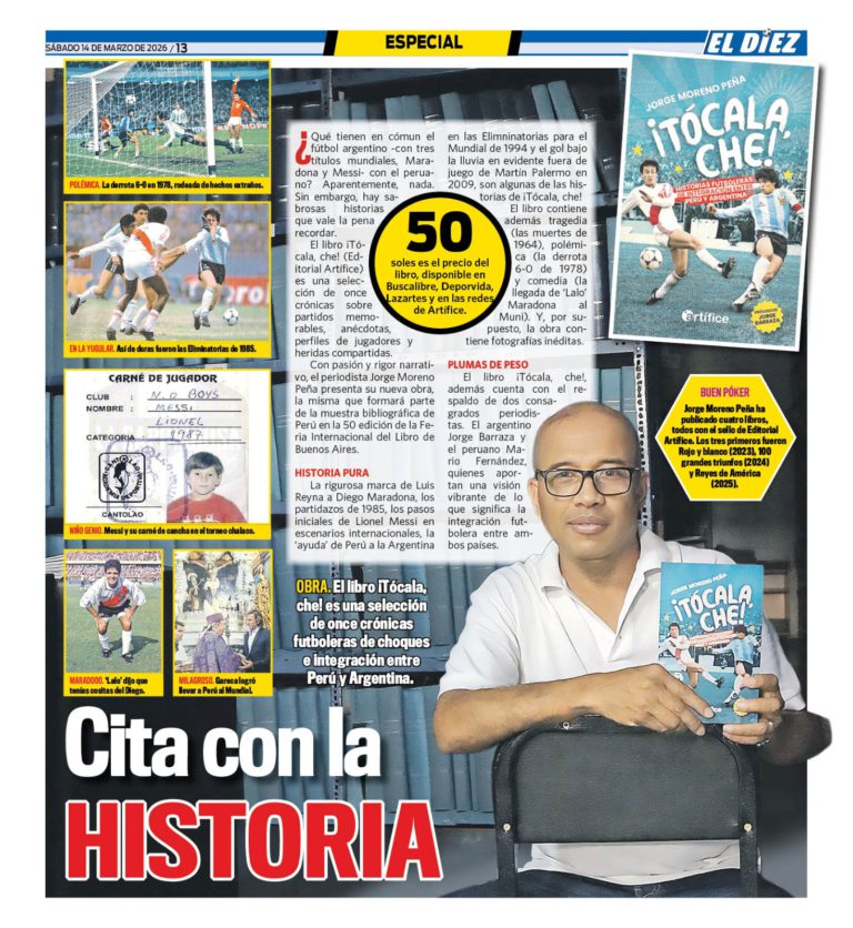 EL DIEZ: LIBRO ‘¡TÓCALA, CHE!’, EL LIBRO CON LAS MEJORES CRÓNICAS FUTBOLERAS DE CHOQUES E INTEGRACIÓN ENTRE PERÚ Y ARGENTINA En medios - marzo 18, 20260 FICHA Medio: El Diez Sección: “Variedades” Fecha: 14 de marzo de 2026 Con mención al periodista y escritor Jorge Moreno Peña, autor del libro “¡Tócala, che! Historias futboleras de integración entre Perú y Argentina”. Lee la nota completa aquí: «“¡Tócala, che!”, el libro con las mejores crónicas futboleras de choques e integración entre Perú y Argentina». Foto: Freepik Compartir con:TweetWhatsAppCorreo electrónico