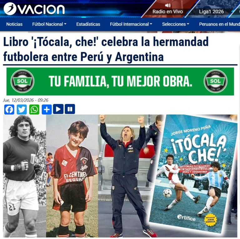 OVACIÓN: LIBRO ‘¡TÓCALA, CHE!’ CELEBRA LA HERMANDAD FUTBOLERA ENTRE PERÚ Y ARGENTINA En medios - marzo 17, 2026marzo 17, 20260 FICHA Medio: Ovación Sección: “Fútbol nacional” Fecha: 12 de marzo de 2026 Con mención al periodista y escritor Jorge Moreno Peña, autor del libro “¡Tócala, che! Historias futboleras de integración entre Perú y Argentina”. Lee la nota completa aquí: «Libro “¡Tócala, che!” celebra la hermandad futbolera entre Perú y Argentina». Foto: Freepik Compartir con:TweetWhatsAppCorreo electrónico