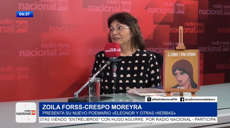 RADIO NACIONAL: LA POETA ZOILA FORSS-CRESPO COMPARTE DETALLES DE ‘ELEONOR Y OTRAS HIERBAS’ En medios - enero 9, 2026enero 7, 20260 FICHA Medio: Radio Nacional Programa: “Entre libros” Fecha: 7 de diciembre de 2025 Entrevista a la poeta y traductora Zoila Forss-Crespo Moreyra, autora del poemario “Eleonor y otras hierbas”. Mira la entrevista completa aquí: «La poeta Zoila Forss-Crespo comparte detalles de “Eleonor y otras hierbas”». Foto: Freepik Compartir con:TweetWhatsAppCorreo electrónico